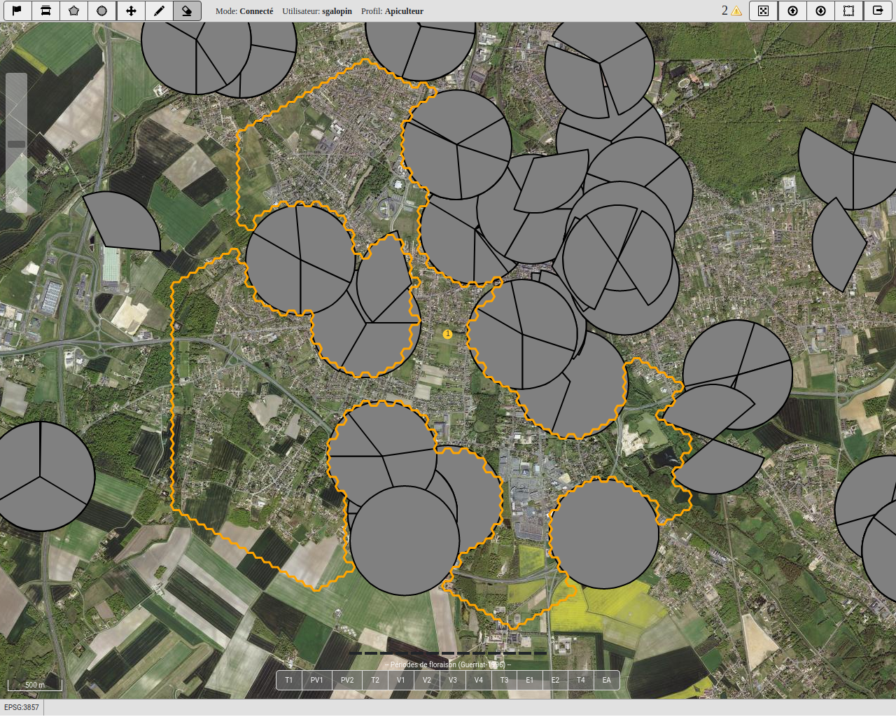 Délimitation de l’aire de butinage d’un rucher en fonction de l’environnement proche. Le projet proposé a pour but de déterminer les aires probables de butinage de chaque rucher. Cette aire dépend de la localisation des antennes, de leur orientation, de leurs caractéristiques techniques, de leur taux d’utilisation, des conditions météorologiques, du relief… Elle dépend également des aménagements bien identifiables comme les routes, les chemins de fer… sans oublier les éléments naturels comme les cours d’eau, les étangs, les différences de niveau…